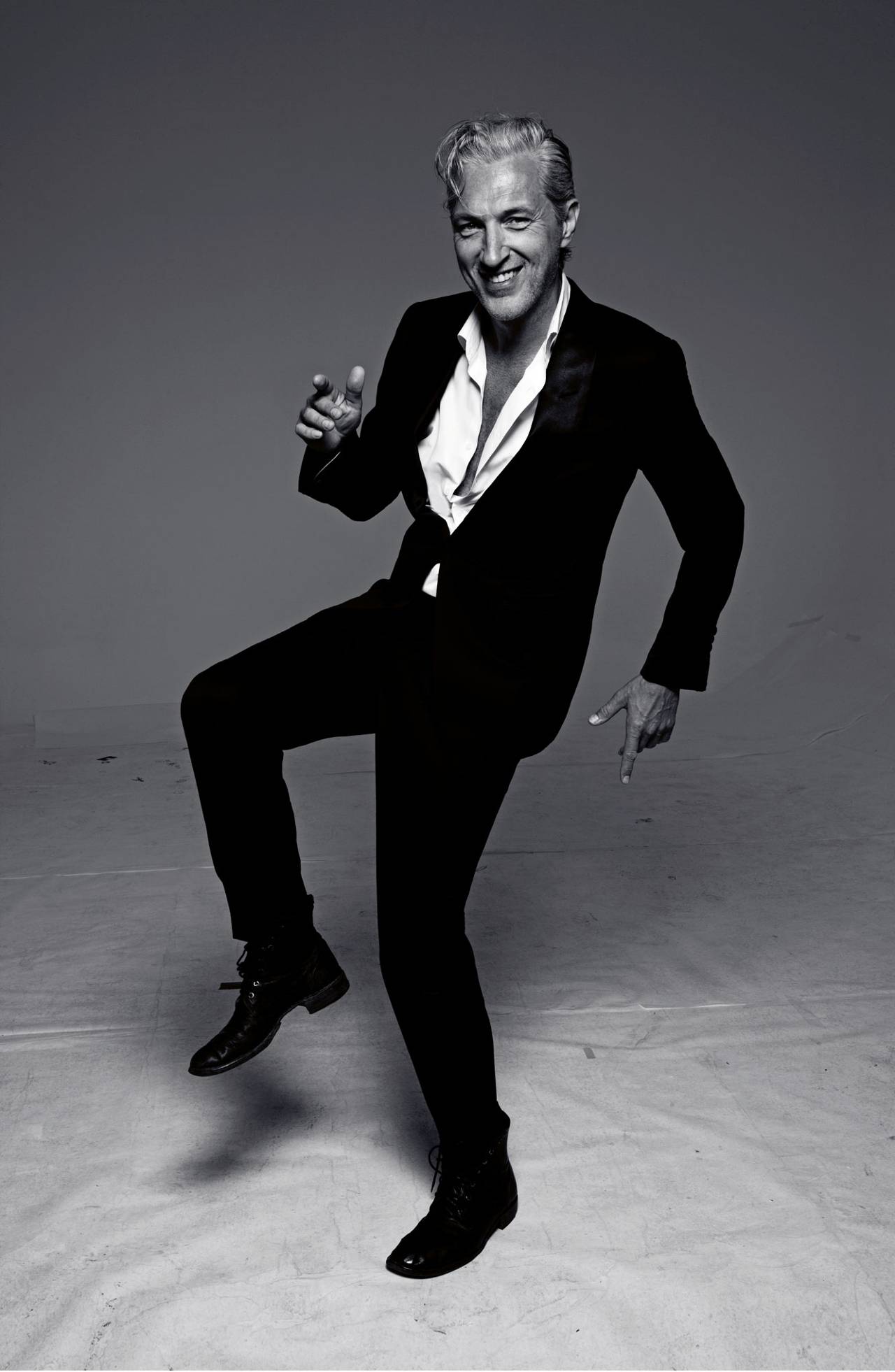 Vandaag geen diadeem in het haar of zijn rainbowketting van parels en stenen strak om de hals. ‘Nee, die heb ik al een tijdje afgezworen. Journalisten zaten er altijd over te zeiken, ik was er klaar mee. Ik draag nog wel mijn maatpakken van Pal Zileri, maar niet meer als Mijn Uniform. Ik heb nu dit leren jack, wat relaxter.’